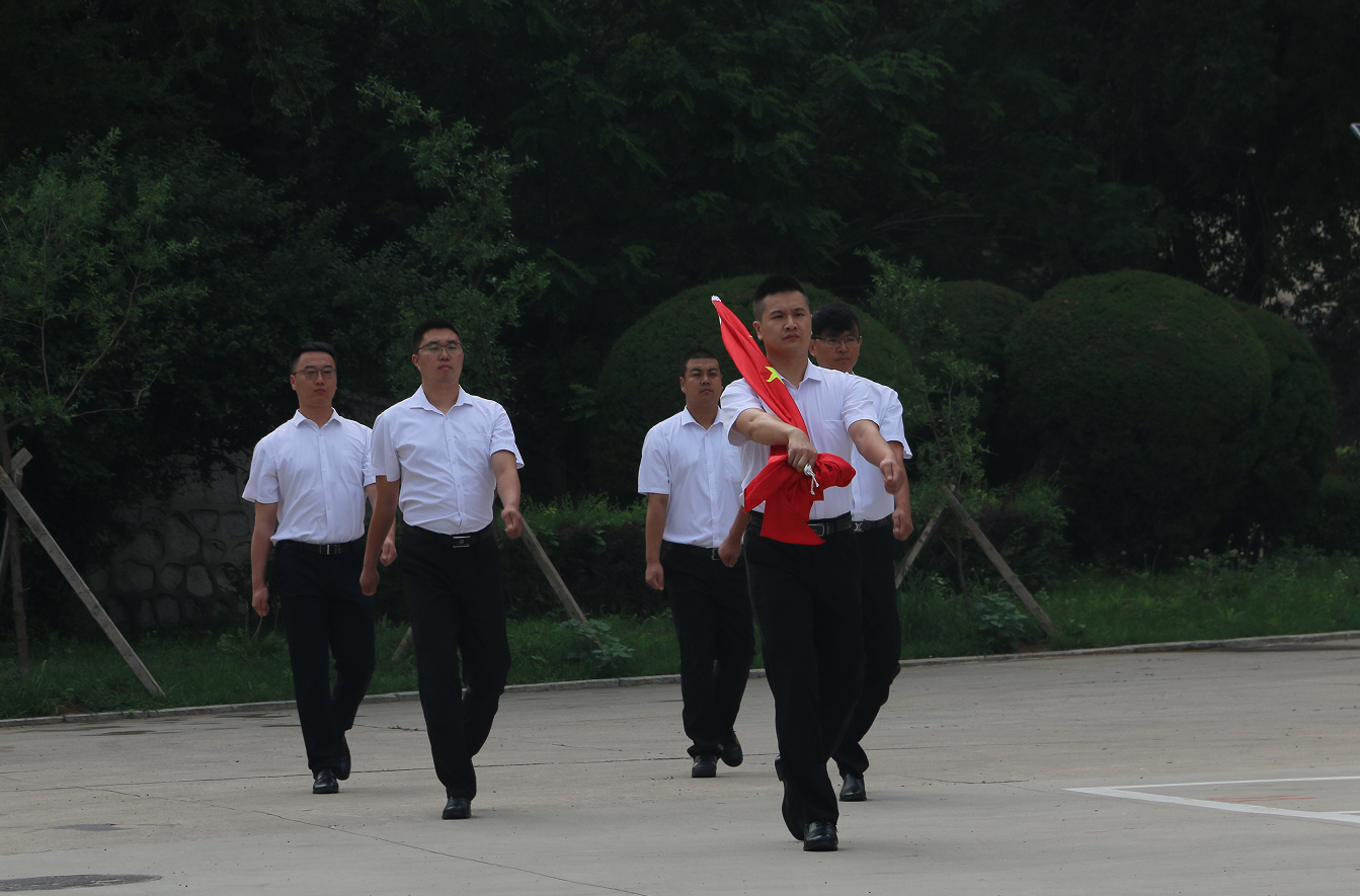 全體黨員整齊著裝,在辦公樓前列隊(duì),英姿颯爽的護(hù)旗手邁著鏗鏘有力的步伐,托舉五星紅旗走向升旗臺(tái)。