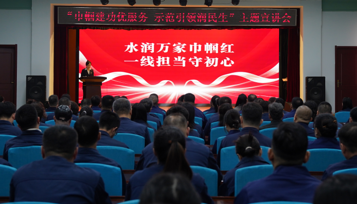 為大力弘揚(yáng)巾幗奮斗精神,充分發(fā)揮先進(jìn)典型示范引領(lǐng)作用,持續(xù)提升水務(wù)民生服務(wù)質(zhì)效,3月26日,水務(wù)集團(tuán)舉辦“巾幗建功優(yōu)服務(wù) 示范引領(lǐng)潤(rùn)民生”主題宣講會(huì)。市婦聯(lián)黨組書記、主席孫艷輝應(yīng)邀出席,集團(tuán)領(lǐng)導(dǎo)班子成員、黨員群眾代表共170余人參加會(huì)議。