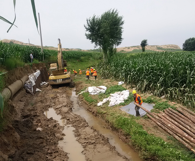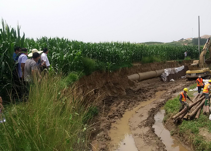 近日,水務(wù)集團(tuán)組織管網(wǎng)巡查人員排查石門水庫三道嶺系列輸水管線時(shí),發(fā)現(xiàn)位于大石橋湯池鎮(zhèn)黃土嶺村DN900線的輸水管線嚴(yán)重裸露在外,如果不及時(shí)處理,再遇雨天,極易發(fā)生輸水管線斷裂,將會(huì)造成沿途及營口城區(qū)營口鋼鐵有限公司等數(shù)十家工業(yè)用水大戶及市區(qū)東部周邊部分居民用戶生產(chǎn)生活用水。水務(wù)集團(tuán)發(fā)現(xiàn)安全隱患后,科學(xué)謀劃,積極制定有效方案,并現(xiàn)場指揮。考慮到若在汛期改線,前期征地、動(dòng)遷等工作無法在短期時(shí)間內(nèi)完成,為保證供水安全度汛,在緊急狀況下,水務(wù)集團(tuán)及時(shí)采取打樁護(hù)管、填土、壘石等措施,進(jìn)行應(yīng)急處理,加固輸水管線,防止管道發(fā)生斷裂。